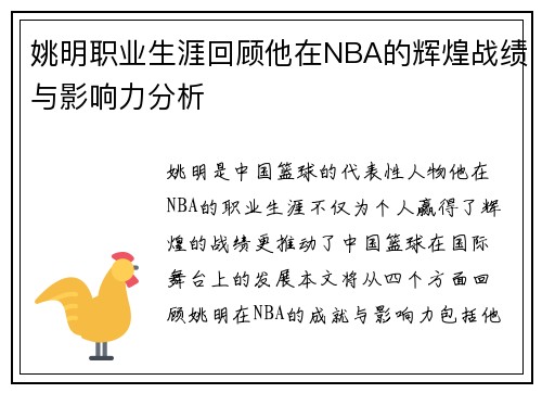 姚明作为中国篮球的代表性人物,其职业生涯的辉煌与挑战一直备受关注。而詹姆斯则是现代篮球的传奇人物,他在场上的表现和对篮球运动的贡献同样不可小觑。本文将围绕姚明深情回顾詹姆斯职业生涯的辉煌与挑战,探讨两位伟大球员之间的友谊与竞争。从詹姆斯的成就与影响力、他所面临的挑战、他们之间的友谊以及篮球竞技精神等...